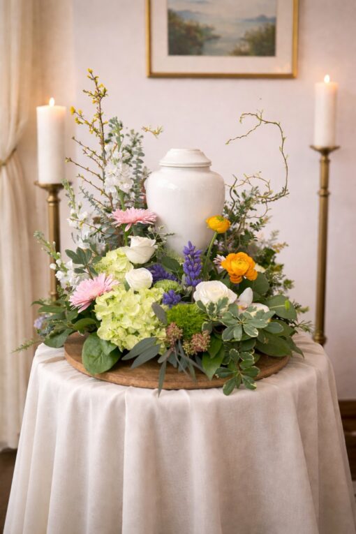 A beautiful and meaningful urn arrangement designed to honor and celebrate a loved one. This garden piece features a soft blend of seasonal blooms including hydrangeas, roses, gerbera daisies, ranunculus, and textured greenery, thoughtfully arranged to surround the urn with warmth and grace.